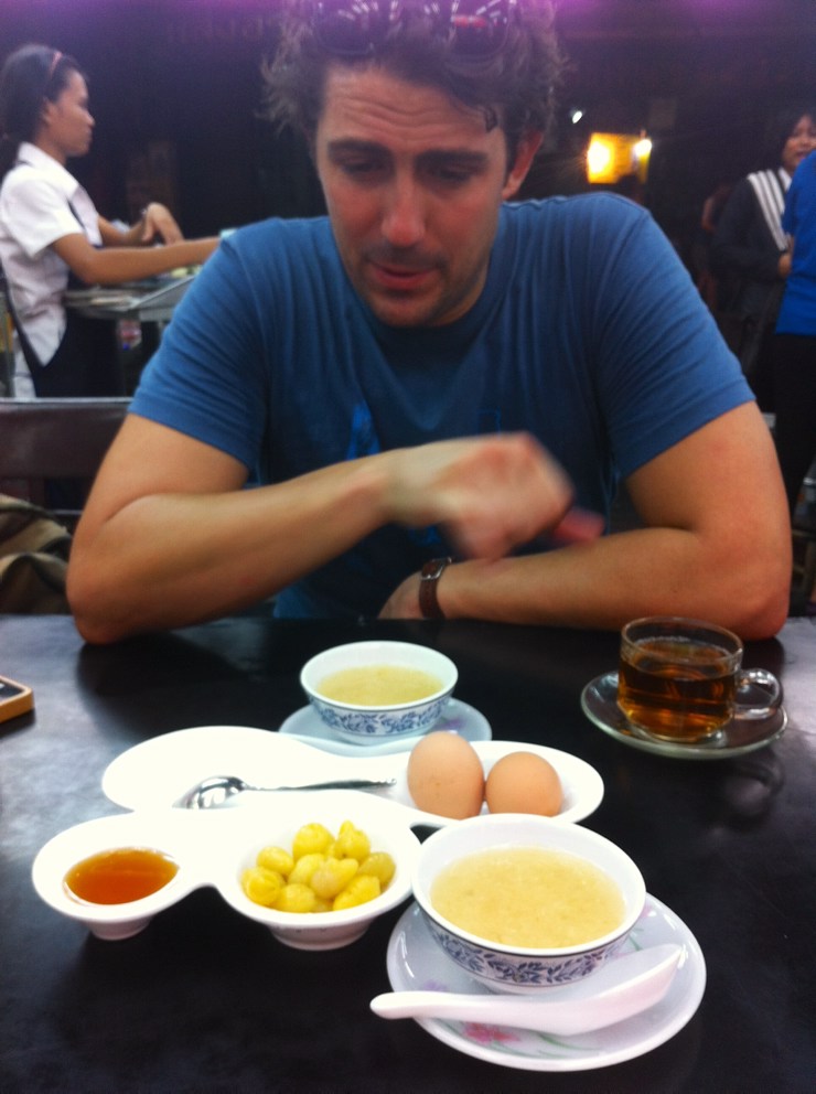 Das Essen einer solchen Suppe gleicht einer Art Zeremonie. Nicht zuletzt isst man die Suppe ja auch wegen ihrer kräftigenden Heilwirkungen. Zur Suppe gibt es noch hartgekochte Eier und Honig sowie einen grünen Tee zum Hinunterspülen. Nach einem Moment der Überwindung legten wir los und versuchten dabei, nicht an geifernde Schwalben zu denken.